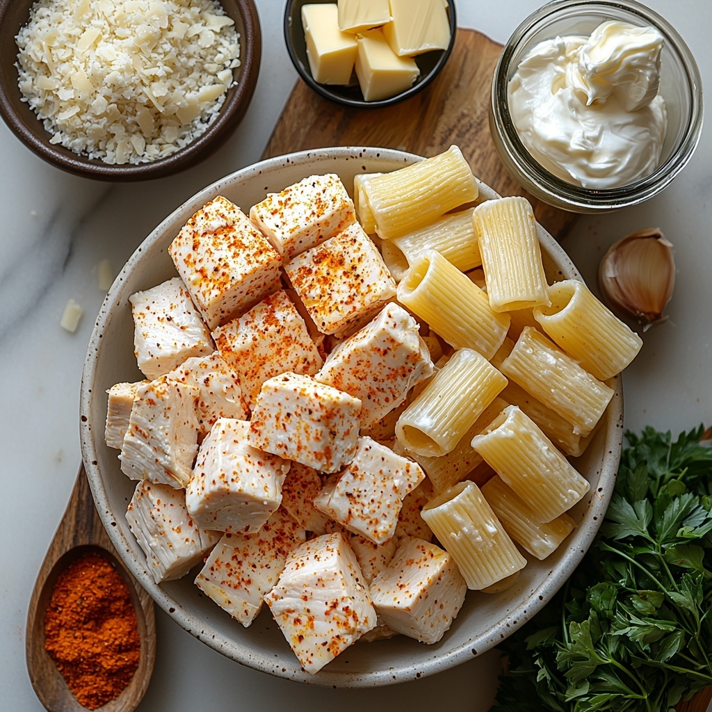 To make this Cajun Garlic Butter Chicken Rigatoni in Cheesy Alfredo Sauce Recipe, you’ll only need a handful of straightforward ingredients, each playing an important role in creating the dish’s irresistible depth and texture. From the smoky Cajun spice that wakes up the chicken to the creamy cheeses that make the sauce silky smooth, these essentials transform simple components into a show-stopping meal.