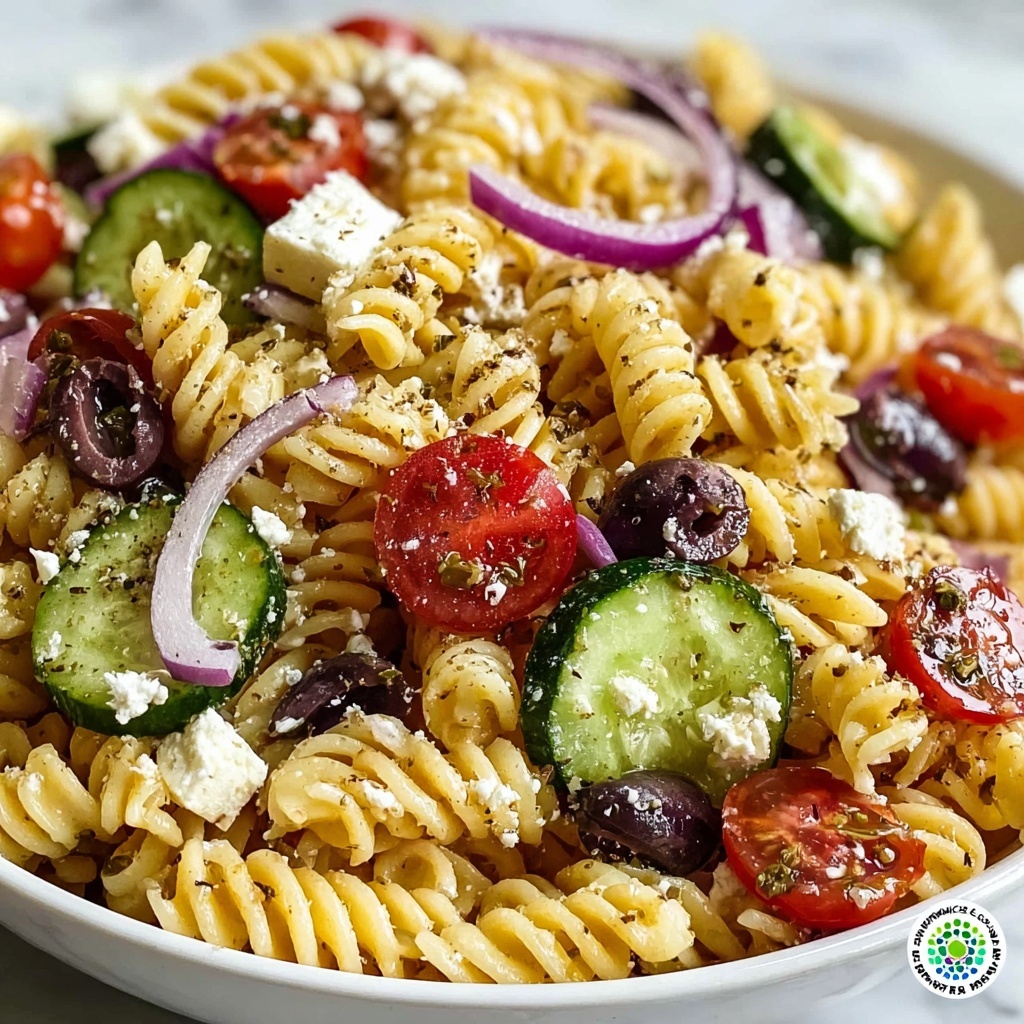 A vibrant and refreshing Easy Italian Pasta Salad featuring tricolor rotini pasta, crisp cucumber, juicy cherry tomatoes, tangy feta cheese, and briny black olives, all tossed in zesty Italian dressing. Perfect for quick lunches, picnics, or as a flavorful side dish.