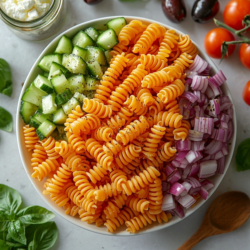 In a large mixing bowl, you’ll want to gather your chopped cucumber, halved cherry tomatoes, finely diced red onion, crumbled feta, and sliced black olives. These fresh ingredients bring great texture contrasts and vibrant color that make your pasta salad as visually appealing as it is tasty.