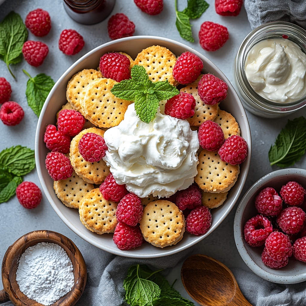 - Gather Ingredients: Collect all necessary ingredients including petits beurre biscuits, fresh raspberries, whipping cream, cream cheese, powdered sugar, vanilla extract, and milk to begin your dessert preparation.