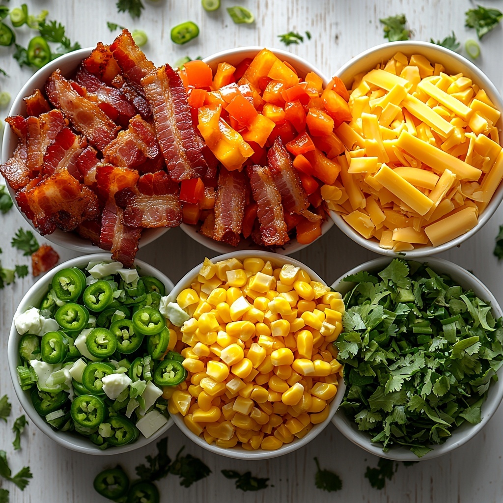 - Combine ingredients: Add the prepared corn, chopped jalapenos, diced red bell pepper, sliced green onions, shredded cheddar cheese, and most of the crumbled bacon to the creamy mixture.