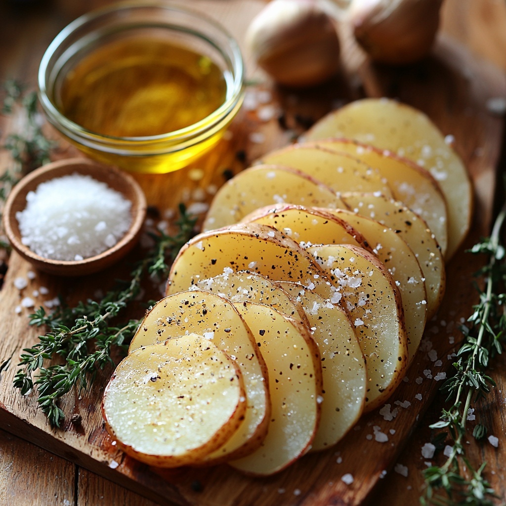 Start by preheating your oven to 375°F (190°C). This moderate heat allows the potatoes to cook slowly and evenly, developing that signature golden crust without burning. Then, wash and peel the russet potatoes. Slice them into thin rounds—around 1/8 inch thick is ideal—for that perfect stackable layer. To keep them from browning and maintain their fresh look, soak the slices in cold water until you’re ready to assemble.