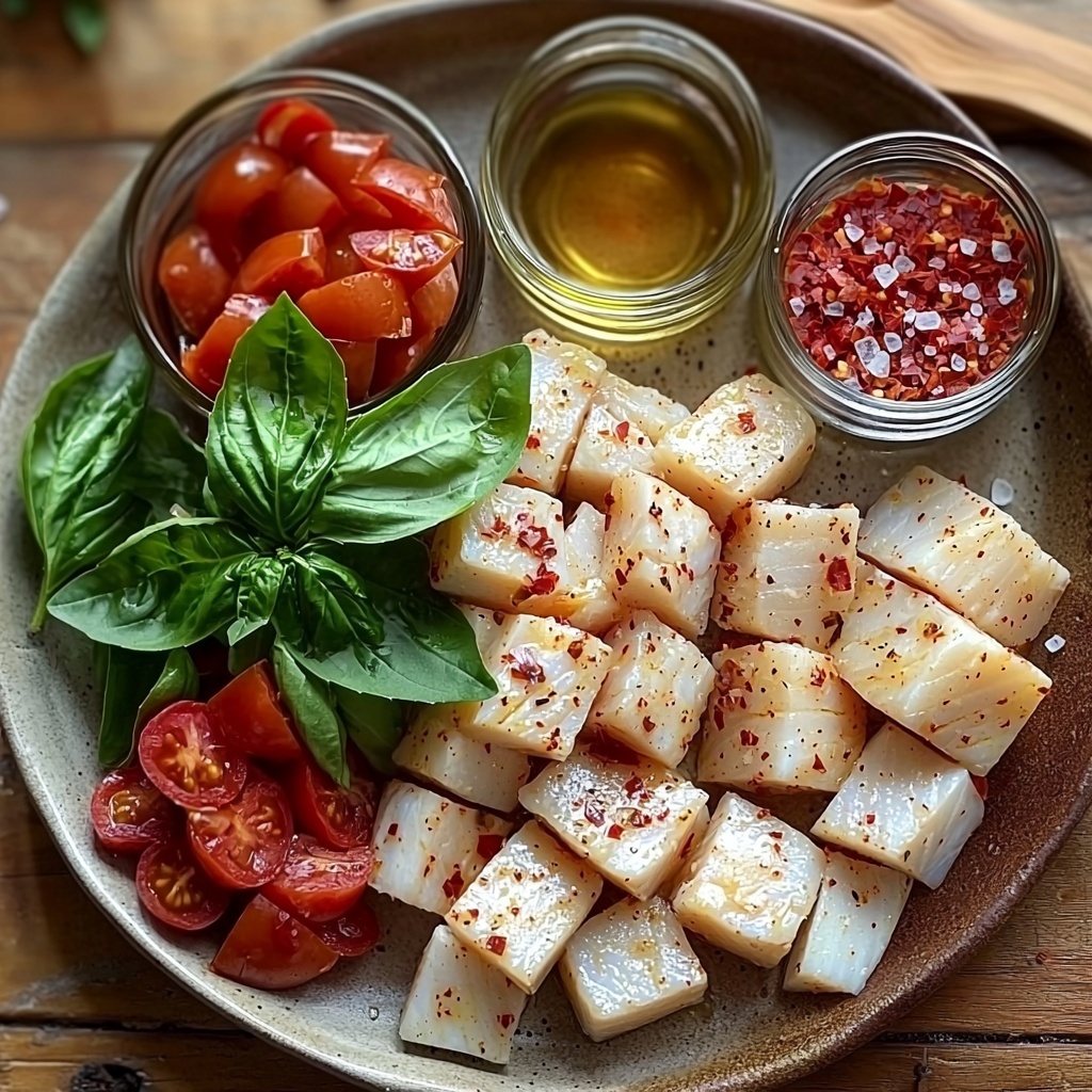 1. Marinate the tilapia: In a medium bowl, combine the tilapia chunks with 1 tablespoon olive oil, 1 teaspoon minced garlic, and ¼ to ½ teaspoon red pepper flakes. Toss gently to coat the fish evenly. Cover and refrigerate while preparing the sauce to allow flavors to meld.