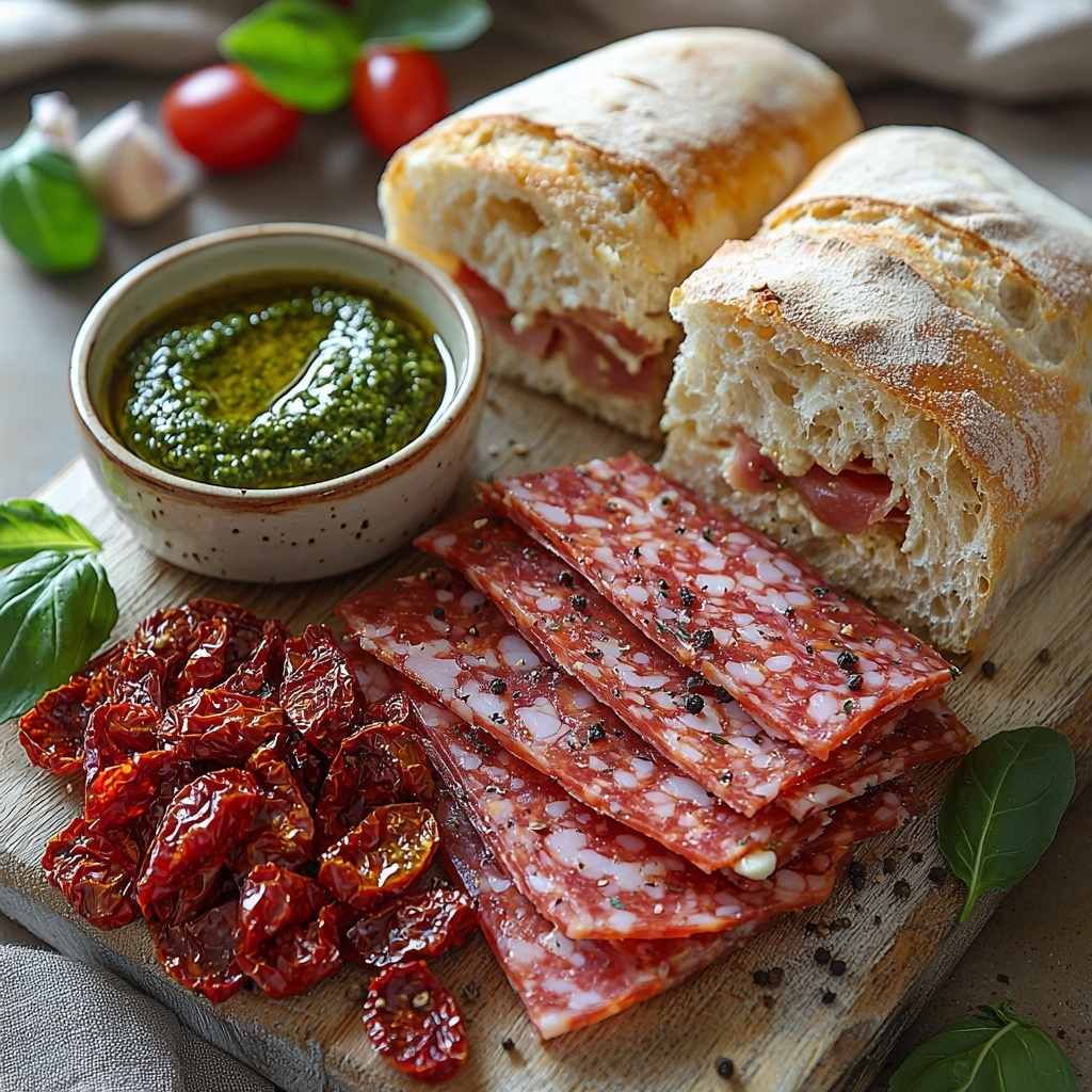 - Apply Spreads and Tomatoes: Spread the pesto sauce evenly on the top half of the toasted ciabatta. On the bottom half, layer the chopped sun-dried tomatoes to add a tangy, rich flavor.
