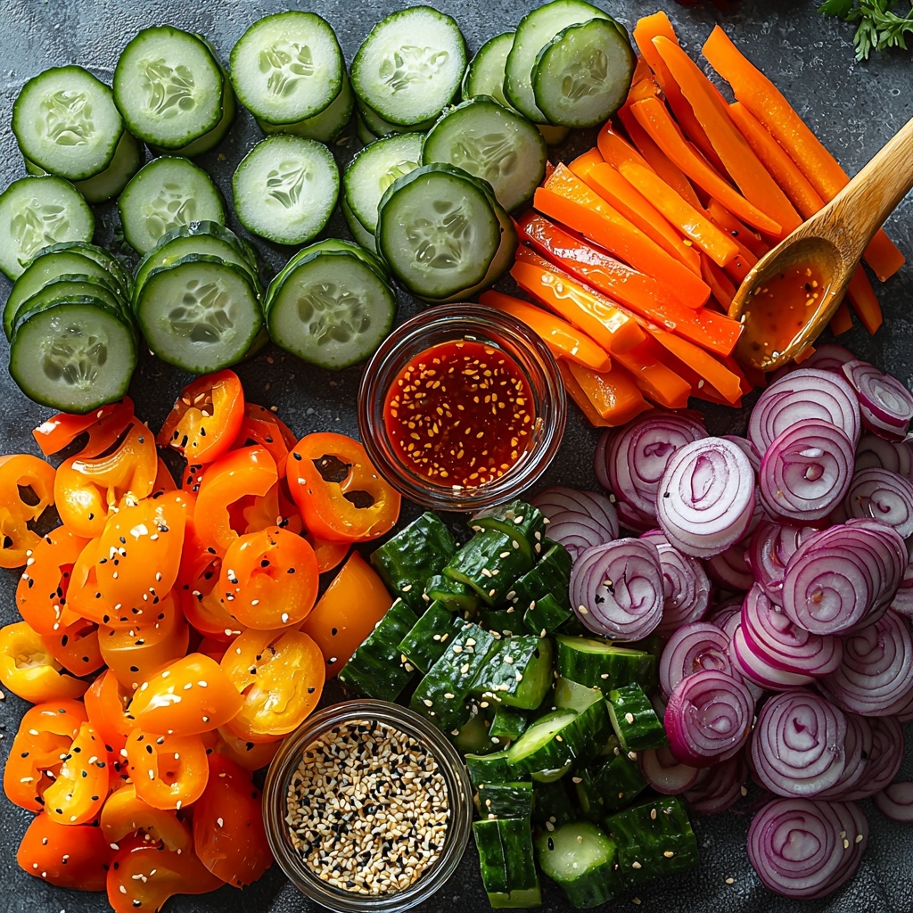 Start by slicing your Persian cucumbers, mini sweet bell peppers, carrots, and shallot into bite-sized pieces. Toss them together in a large mixing bowl so that every forkful will offer a medley of fresh, vibrant flavors and textures. This step is all about building a solid veggie base that’s both colorful and crisp, setting the stage for that dressing magic to come.